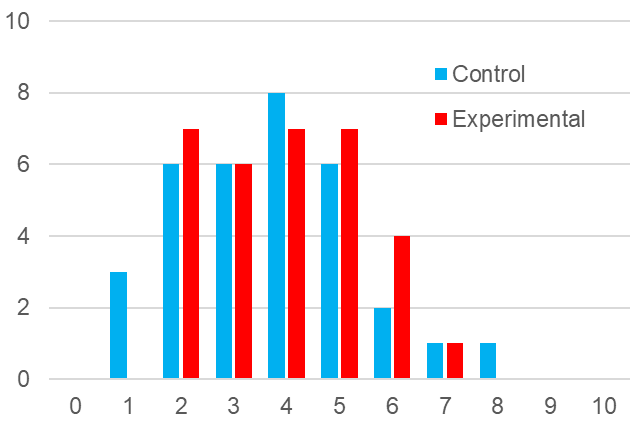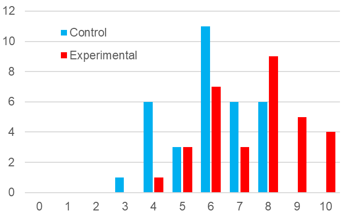Los respectivos diagramas de frecuencia se muestran en la Fig. 6. En esta ocasión las medidas de tendencia central no son similares. Los datos son más dispersos en el caso del grupo experimental y la diferencia de medias sigue estando a favor del grupo experimental, pero esta vez es de 1,47 puntos que corresponden a un 24,5 %.