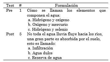 Pre-test: a manera de evaluación diagnóstica, se diseñó un cuestionario de 10 preguntas cuyo tema central fue el uso sostenible del recurso agua. Posterior-mente, se aplicó de manera individual a todos los estudiantes de ambos grupos durante una sesión de una hora. El objetivo del mismo no fue solo determinar los conocimientos previos de los estudiantes sobre el tema en cuestión, sino también establecer un punto de partida para la comparación entre los dos grupos.