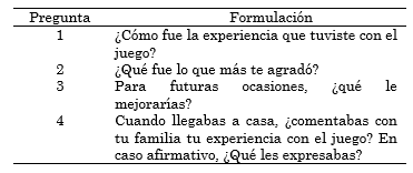 Una vez terminado el post-test, y solo al grupo control, se le realizó una encuesta de satisfacción con cuatro preguntas para ser contestadas durante una sesión de 30 minutos. La primera pregunta era cerrada y con una escala tipo Likert de 1 a 3, en donde 1 representaba la respuesta “buena”, 2 “regular”, y 3 “mala”. Las tres preguntas restantes fueron abiertas, con la finalidad de conocer el nivel de interés por el juego, el impacto en la experiencia y el agrado por la metodología usada durante la intervención. A diferencia del cuestionario de conocimientos, dicha encuesta se realizó de manera anónima. Las preguntas utilizadas se muestran en la Tabla 2.
