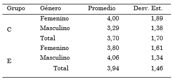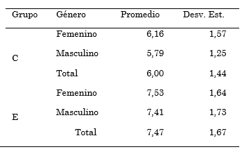 Un resumen de los resultados obtenidos en el pre-test de conocimientos se presenta en la Tabla 3, discriminados tanto por grupo como por género.