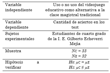 Para constatar la eficacia del juego propuesto se realizó una investigación de corte cuantitativa cualitativa, con un diseño metodológico cuasi experimental. “Experimental”, porque lo que se busca es establecer efectos causales de la variable independiente, en este caso el uso o no del juego, controlando las fuentes de validez interna; y “cuasi”, porque los grupos intervenidos no son seleccionados completamente al azar, sino que provienen de un agrupamiento predefinido externamente. Más específicamente, se realizó una intervención de tipo pre-test/post-test, con grupos de control y experimental. Las condiciones de ambos grupos fueron idénticas en cuanto se componen de estudiantes de una misma institución educativa, que comparten el mismo docente y reciben las mismas clases con la misma intensidad horaria.