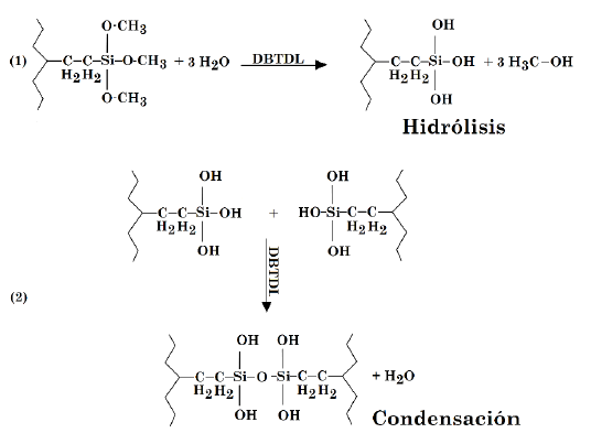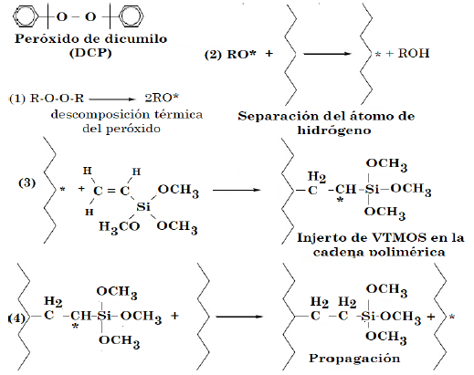 Para la fabricación del LLDPE injertado primero se efectuó la infusión del silano en el material, mediante una mezcla manual utilizando un recipiente plástico durante 10 minutos; posteriormente se dejó reposar la mezcla por 24 horas antes de llevar a cabo la reacción de grafting (injertado) en el Lab-Compounder Brabender. Esta reacción se lleva a cabo sin que se presente entrecruzamiento, tal como se ilustra en la Fig. 1. El injerto del LDPE se realizó en tandas de 300 gramos.