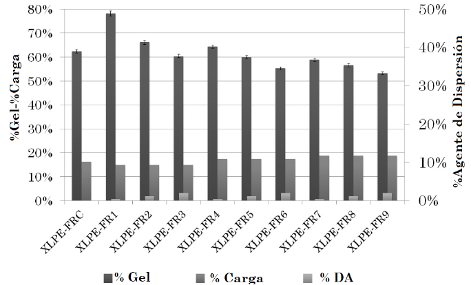 Al observar los aislamientos que son fabricados con los MBFR que presentaban un mismo contenido de agente de dispersión, pero niveles de carga diferentes, se encuentra que entre mayor sea el contenido de carga del MBFR, menor es el contenido de gel del aislamiento. En este sentido, el entrecruzamiento del XLPE-FR, se favorece en los aislamientos que se caracterizan por ser fabricados con bajos niveles de cargas y bajos niveles de agente de dispersión. El aislamiento que presentó un mayor valor en el contenido de gel fue el XLPE-FR1, caracterizado por contar con el menor nivel de carga y agente de dispersión. Por el contrario, el aislamiento con menor valor de contenido de gel fue el aislamiento XLPE-FR9, que presentó el mayor contenido de cargas y de agente de dispersión.
