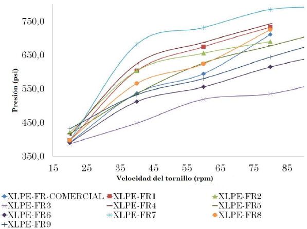 El XLPE-FRC, fabricado con el MBFR comercial, tiene valores de presión, durante la extrusión, que son considerados intermedios con respecto a los nueve aislamientos resultantes del diseño de experimentos. Los XLPE-FR que más se acercan al comportamiento del XLPE-FRC son el XLPE-FR6, XLPE-FR5, XLPE-FR8 y XLPE-FR9. Para un proceso industrial resulta favorable que la presión de extrusión del aislamiento XLPE-FR no sea elevada, para ello se toma como patrón de referencia el XLPE-FRC, lo cual permitió identificar que los aislamientos con mejor comportamiento en un proceso industrial desde el punto de vista de la presión de extrusión, serían los aislamientos con valores de presión próximos e inferiores a los presentados por el XLPE-FRC.