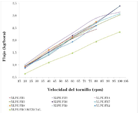 En la Fig. 5 se presenta la correspondencia existente entre el flujo de salida del material en el cabezal de extrusión y la velocidad del tornillo. En ella se observa que el aislamiento XLPE-FRC es el material con menores valores de flujo a la salida del cabezal de extrusión, para las diferentes velocidades evaluadas, cuando fue comparado con el flujo de salida de los nueve XLPE-FR experimentales. Para los aislamientos fabricados con los MBFR caracterizados por contener niveles de agente de dispersión bajo y medio, se puede observar que a medida que se incrementa la proporción de la carga sin modificar el nivel de agente de dispersión, el flujo de la mezcla XLPE-FR a la salida del cabezal tiende a reducirse. Este fenómeno no fue observado para los aislamientos fabricados con MBFR de alto nivel de agente dispersión, encontrándose adicionalmente que en estos a medida que se aumenta el nivel de carga en el MBFR, manteniendo constante el nivel de agente de dispersión, el flujo del XLPE-FR permanece estable. También es de resaltar que para aislamientos fabricados con los MBFR donde se mantiene constante el nivel de carga, al incrementar el contenido de agente de dispersión en el MBFR, el flujo del XLPE-FR a la salida del cabezal se incrementa. Lo anterior se observa para los niveles de carga bajo, medio y alto.