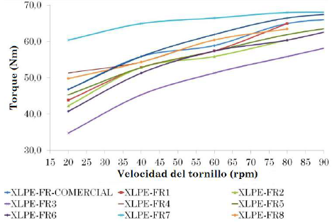 En la Fig. 6 se muestra la correspondencia existente entre el torque de extrusión y la velocidad del tornillo. En ella se observa que para las diferentes velocidades de tornillo evaluadas, los XLPE-FR fabricados con MBFR de bajo nivel de carga, presentan los menores valores de torque durante su extrusión. Además de ello, al aumentar el contenido de agente de dispersión en el MBFR manteniendo constante el contenido de carga, se observa que el valor del torque de extrusión del XLPE-FR se reduce. Este comportamiento se presenta para los XLPE-FR fabricados con medio y alto nivel de cargas. Para aislamientos XLPE-FR fabricados con MBFR del mismo contenido de agente de dispersión, pero con valores de carga variables, se encuentra que a mayor contenido de carga, el torque de extrusión del XLPE-FR aumenta. Adicionalmente, en la Fig. 6 se observa que el XLPE-FR3, es el aislamiento que presenta menores valores de torque durante su extrusión, para las diferentes velocidades de tornillo. El MBFR3 empleado para fabricar el XLPE-FR3, se caracteriza por contener el nivel de carga menor y el nivel de agente de dispersión mayor, reuniendo las dos condiciones requeridas para favorecer que se presente el menor torque de extrusión. El aislamiento XLPE-FR7, fabricado con el MBFR7, es el aislamiento que durante su extrusión requiere de mayor torque para ser procesado, debido a que el MBFR7 contiene el nivel de carga mayor y el nivel de agente de dispersión menor.