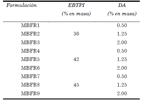 Los datos obtenidos durante la evaluación de los aislamientos fabricados con los diferentes MBFR en la prueba de llama FT2 son reportados en la Tabla 3.