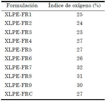 El índice de oxígeno (LOI), fue medido en placas elaboradas con las diferentes formulaciones descritas en la Tabla 1, incluyendo adicionalmente la basada en el MBFR comercial (XLPE-FRC). Los valores de LOI se registran en la Tabla 2. Se encontró que, al aumentar el nivel de agente de dispersión, manteniendo constante el contenido de cargas, el valor de LOI se reduce ligeramente.