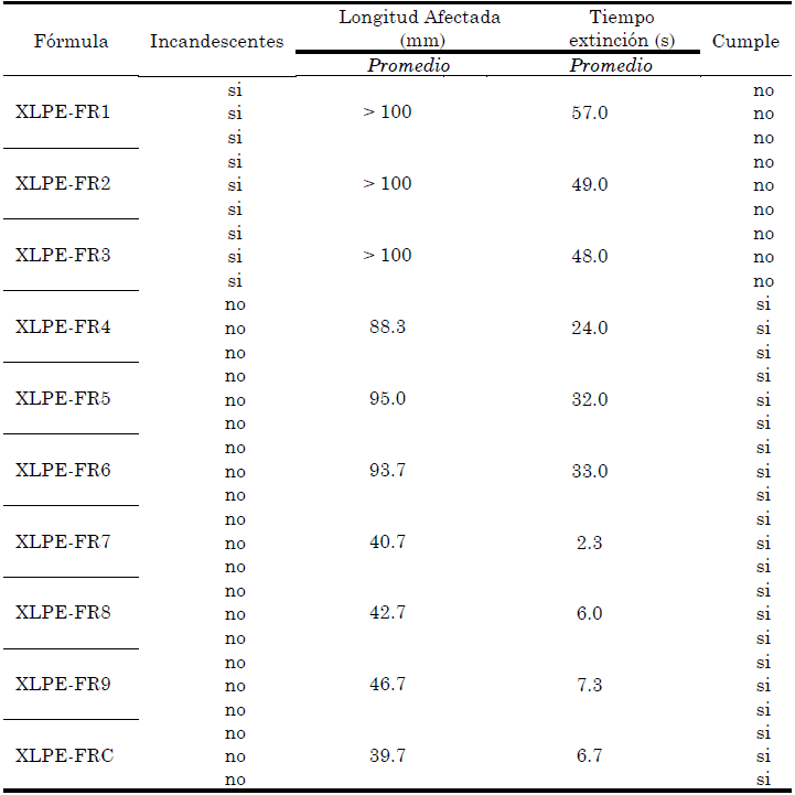Aquí se tuvo en consideración los parámetros definidos en la norma UL44, como son la presencia de partículas incandescentes y la longitud de cable afectada, además, como evidencia adicional, se registró el tiempo que el aislamiento requirió para extinguirse, de tal manera que se pudiera diferenciar el mejor desempeño ignifugo. A partir de los datos registrados en la Tabla 3, se puede observar que el contenido de cargas retardantes a la llama empleados en los compuestos MBFR1, MBFR2 y MBFR3 (60 %), resultó no ser suficiente para dar cumplimiento a la prueba de llama en los aislamientos XLPE-FR 1, XLPE-FR2 y XLPE-FR3, debido a que la llama sobrepasó los límites establecidos por la norma y adicionalmente se genera desprendimiento de partículas incandescentes que queman el algodón ubicado en la base del montaje del experimento. Por otra parte, los resultados son satisfactorios en los aislamientos XLPE-FR4, XLPE-FR 5, XLPE-FR6, XLPE-FR 7, XLPE-FR8 y XLPE-FR9. En estos materiales la propagación de la llama fue simétrica y se mantuvo dentro de los límites indicados por la norma; así mismo, no se presentó goteo de material fundido, ni liberación de partículas incandescentes durante la prueba.