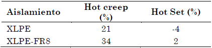 Por otro lado, los valores promedios obtenidos en la prueba de termofluencia para tres muestras de cada aislamiento son consignados en la Tabla 4. La prueba fue realizada sobre aislamientos de cables fabricados con el MBFR8.