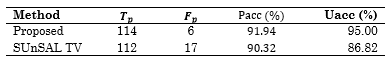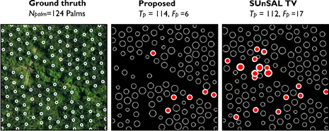 Where 𝑁𝑝𝑎𝑙𝑚 is the total number of palm trees in the image; 𝑇𝑝, the true positive detection indicating the number of detected palms trees; and F𝑝, the false negative detection indicating the number of palm trees that were not detected (missed). Fig. 9 shows some palm and no-palm templates highlighted with circles bythe CHT algorithm. In the first image, the white circles represent the true location of oil palms. In the second and third images, the white circles represent T𝑝, and the red circles represent F𝑝, which are estimated from abundance map by the proposed method and SUnSAL TV, respectively. For example, the oil palms missing in the detection are marked with red circles. Oil palm trees can be missing from the detection because of the presence of other objects or tree crowns close together. Table 1 illustrates the detection results using different measurements. Note that the results suggest that the proposed method is the most promising strategy as preprocessing step before oil palm mapping.