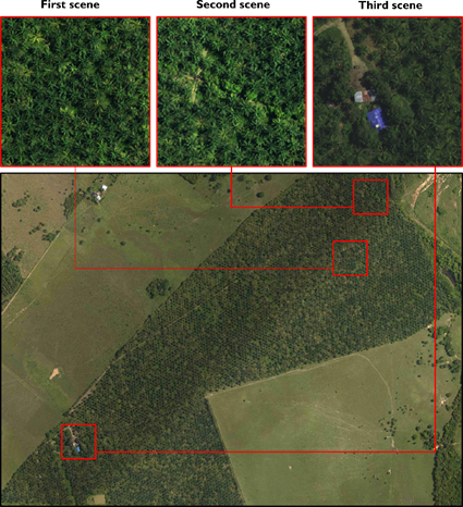 In this section, the proposed framework is compared with two state-of-art unmixing methods: SUnSAL [23] and SUnSAL TV [24]. Fig. 8 illustrates the performance of the proposed computational framework with the third scene. Comparisons with pure pixel estimation methods were conducted, and the obtained results shown the effectiveness of the proposed method to map oil palm plantations. It can be seen that this area is not homogeneous. Namely, it contains objects that are not oil palm trees, i.e., buildings, other trees, and shadows.