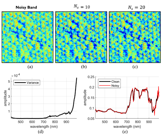 This section explores the effect of selecting the parameter 𝜆𝑇𝑉 and the number of features 𝑁𝑠 on the performance of the proposed method for oil palm identification. In the inference experiments, such as unmixing, classification, and detection, the estimators have been improved when denoising techniques are applied as a preprocessing step. Fig. 3(a) is the original noisy spectral band 160, while Figs. 3(b) and 3(c) show the clean spectral band 160 when the rank of the matrix 𝚾 is 𝑁𝑠 = 10 and 𝑁𝑠 = 20, respectively. As can be seen in Fig. 3(d) (diagonal covariance matrix), the high noise is present in the 160 band, which can be observed in Fig. 3(e) that the pixel in the clean dataset is smooth with respect to the original pixel in the noisy dataset. The estimation of the number of endmembers is a critical stage in the unmixing. In this work, we consider two of the most widely used approaches: virtual dimensionality (VD) [25], which allows some flexibility in the estimation by having an additional input parameter that enables the control of the sensitivity of the method, and hyperspectral signal identification with minimum error (HySime)[17], which offers advanced features when modeling the noise present in the HSIs. The average number of endmembers estimated by the HySime algorithm for the three scenes was 9 endmembers. However, based on knowledge of the actual terrain and each scene used in this work, the endmembers with the greatest abundance and interest in this study are shown (diseased oil palm, healthy oil palm, grass, soil, and roof).