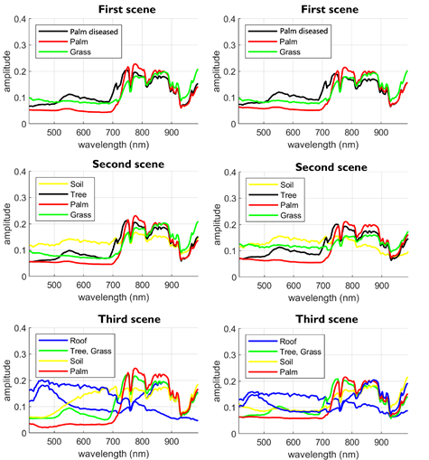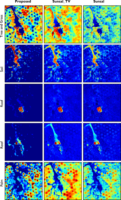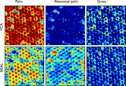 Moreover, the SUnSAL and SUnSAL TV methods could merge some trees together due to the presence of spectral variability or when the distance between them is short. In that case, the regions obtained as palms and non-palms using the proposed method are quite evident.