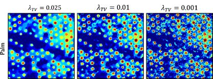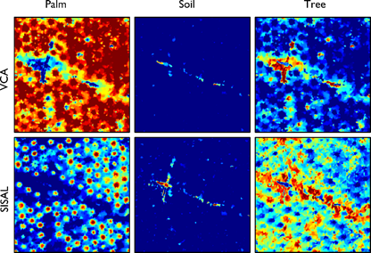 The SISAL regularization parameters were set to 𝜆 = 10, and the remaining parameters were set to 𝜏 = 1 and 𝜇 = 10-4. Fig. 4 shows the endmember signatures estimated by using SISAL (first column) and VCA (second column) for each scene. Note that the results of endmembers estimated by VCA in the three scenarios are very similar to those of SISAL. However, when abundances are estimated, the difference between VCA and SISAL is noticeable. Figures 5 and 6 show the abundances using the proposed method for the first and second scene, respectively, when the endmembers matrix is initialized using VCA (first row) and SISAL (second row). In optimal conditions, the algorithm without the pure pixel assumption offers a better performance. In the abundance results in the second row in Fig. 6, the red points indicate the oil palms detected by the proposed method and the blue spaces, other types of objects. Note that the proposed method achieves great oil palm identification results using SISAL, as opposed to when the endmembers are initialized with VCA. Furthermore, Fig. 7 shows the effect of the parameter 𝜆𝑇𝑉 on palm identification; the proposed method is applied to the dataset with three different values of 𝜆𝑇𝑉 = 0.025, 0.01, 0.001 and 𝑁𝑠 = 10. It can be seen that using 𝜆𝑇𝑉 = 0.01 yields better results than other cases.