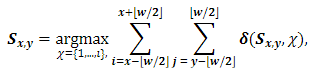 where, F ̃ is the incomplete image, and H ∈ is the selecting matrix that has only one non-zero value per row, with P as the number of preserved pixels. Therefore, the SSC model is applied to obtain the clustering results for those pixels. This segmentation can be represented in , which is a vector with the labels of the preserved pixels. In order to obtain the incomplete labels, let = Hs be a vector where the missing positions are present. Then, this vector is reorganized in a matrix (see Fig. 1), where the incomplete labels are obtained applying a kind of filter that selects the predominant label in a given window; in this case, of a 3 ×3 size. Specifically, when χ={1, ...,ı} denotes the set of ı class labels, those missing values are given by (5):