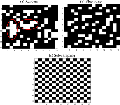 For instance, ζr = 0.2 means that 20% of the pixels would be preserved and 80% of the pixels would be removed after applying (4). A conventional selection matrix uses random entries; however, random binary codes tend to form clusters. Figure 2 (a) shows an example of a random matrix with ζr = 0.75, where matrix H is represented as an M × Nmatrix where white spaces mark the pixels to remove, and black represents the pixels to keep. Note that the random matrix tends to form clusters, which leads to a negative impact when the non-labeled pixels in the incomplete image are assigned using the strategy presented in Section 3. For that reason, a blue noise pixel distribution is used in order to reduce clusters and achieve uniform selected pixels, as shown in Fig. 2. (b) [25].