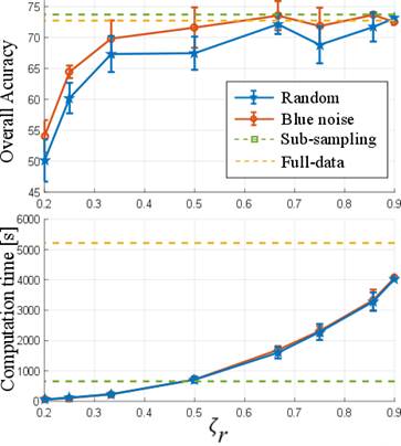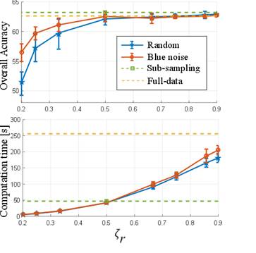The first test was performed to show the quality of the results and the computational time using the number of eliminated pixels by means of the preservation ratio (ζr). For that purpose, the proposed methods were compared with random elimination and the complete image. The Indian Pines and Pavia University data tests were used in this test. Figure 3 and 4 show the general accuracy and the computational time obtained with the different configurations for the two data sets, respectively. Note that, in the sub-sampling method, the preservation ratio is fixed at ζr = 0.5 and, with the full image, it is ζr = 1. It can be observed that, when the number of preserved pixels increases, the quality of the classification by the designed and randomized elimination schemes improves. However, the designed blue noise scheme outperforms the random selection matrix with ζr ≤0.5 for both data sets. In addition, the proposed methods maintain a performance comparable to the full data when more than half of the pixels are conserved. Fig. 3 and 4 also show the time spent applying different preservation ratios and a drastic increase in computational time as the number of removed pixels decreases.