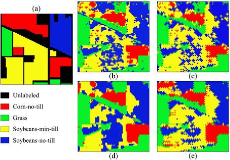 The Indian Pines hyperspectral data set, sensed by the AVIRIS sensor, has 145 × 145 pixels and 224 spectral bands [30]. A total of 20 water absorption and noisy bands were removed, thus leaving 200 spectral features for the experiments. A known sub-image of the Indian Pines data set was used in the test; its spatial dimensions are 70 × 70 pixels, and it includes four main-land cover classes: corn-no-till, grass, soybeans-minimum-till, and soybeans-no-till [9].