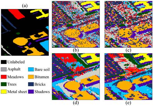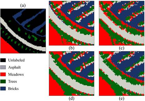 The second scene, of Pavia University, was acquired by the Reflective Optics System Imaging Spectrometer (ROSIS) airborne sensor over an urban area of Pavia, Northern Italy. The size of the image is 610 340 pixels and 103 spectral bands [9]. For the tests, the authors selected a typical area of a size of 140 80 pixels containing eight main land-cover classes: asphalt, meadows, trees, metal sheet, bare soil, bitumen, bricks, and shadows. Furthermore, a different region of ROSIS Pavia University data set was also used; its size is 64 64 pixels, and it contains four land-cover classes: asphalt, meadows, trees, and bricks.