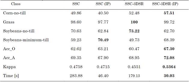 The second test shows the advantages of the sub-sampling method because SSC with spatial regularizer (SSC-SR) algorithms can be used. Therefore, the SSC with a 3D spatial regularizer (SSC-3DSR) was employed for this test [22]. Figure 5 and Table 1 show the detailed results of the classification and computational time, respectively, for the Indian Pines data set. Note that the SSC-3DSR and SSC-3DSR (IP) obtained a better clustering accuracy. In addition, the proposed approach obtained clustering results comparable to the classification of the full data by the SSC and SSC-3DSR methods. Nevertheless, the proposed method reduces the computational time by 83.65% and 83.23% compared to SSC and SSC-3DSR, respectively.