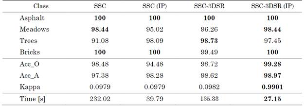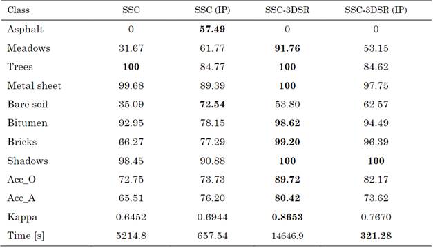 Finally, the classification performance achieved for the other region of the Pavia University dataset is shown in Fig. 7, and the quantitative results are presented in Table 3. Note that the quality is preserved, but our method is 5 times faster for this subregion of Pavia University.