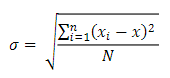 Standard deviation, the most common dispersion measure, indicates how scattered the data are with respect to the mean; the higher the standard deviation, the greater the dispersion of the data [17] (3), where: xi is a value of a data set; x is the average of the data set; and N is the number of data.