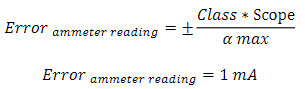 Analogously, the uncertainty, in the case of the current measurement made with the analogue ammeter, is related to the error in the readings provided by the manufacturer, which is called “Class” and a rectangular probability distribution, (17) and (18):