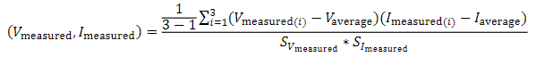 For this problem, it will be necessary to determine the correlation between the average Voltage = 𝑉𝑚𝑒𝑎𝑠𝑢𝑟𝑒𝑑 and average Current = 𝐼𝑚𝑒𝑎𝑠𝑢𝑟𝑒𝑑. We should take into account that the product of the two standard deviations (24), can also be seen in (23).