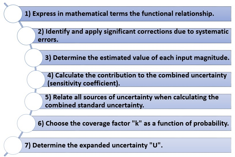 The first step is to express, in mathematical terms, the dependence of the magnitude of output with respect to the input. Then, significant corrections due to systematic errors are identified and applied. The estimated value of each input variable is determined with statistical analysis, calculating, for each input variable, the contribution to the combined uncertainty and observing whether there is a correlation between the random variables. Next, a coverage factor 𝒌 is selected as a function of the probability to determine the expanded uncertainty 𝑼. Finally, the result of the measurement is expressed, indicating the estimated output, the associated expanded uncertainty, the coverage factor, and the type of assumed distribution.