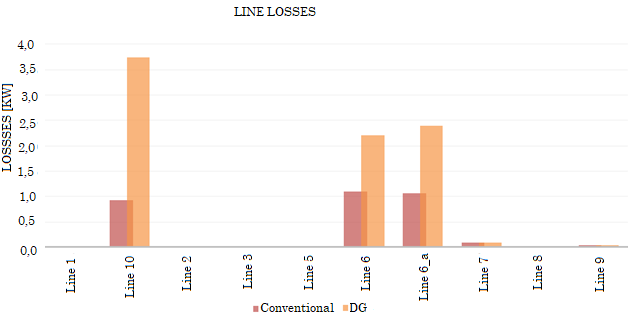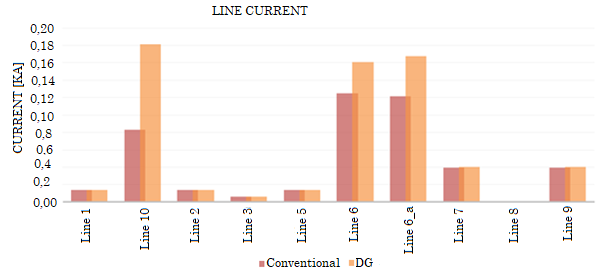 Fig. 8 compares the line losses in the conventional and DG scenarios; and Fig. 9 the line currents in the same scenarios. Table 5. lists the changes in electrical line losses in both scenarios. In this case, the line losses decreased. Due to the implementation of the new generators, the current flow of Line 10 increased from 83 to 181 amperes, which directly affects the losses in that line.