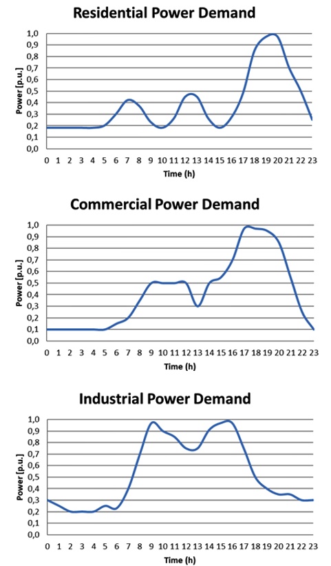 For each load in the IEEE 13-node system, a daily demand curve was modeled based on the power demand curves of the Colombian residential, commercial, and industrial sectors [14]. Industrial nodes were included with DG since they represent potential users that could have the economic resources to acquire and generate electricity independently, although industries could obtain better profits from eventual discounts and assistance offered by the Colombian government, making self-generation more attractive for investors.