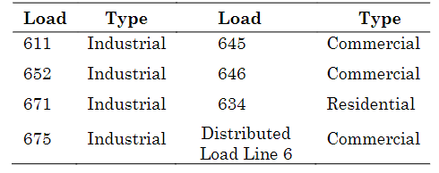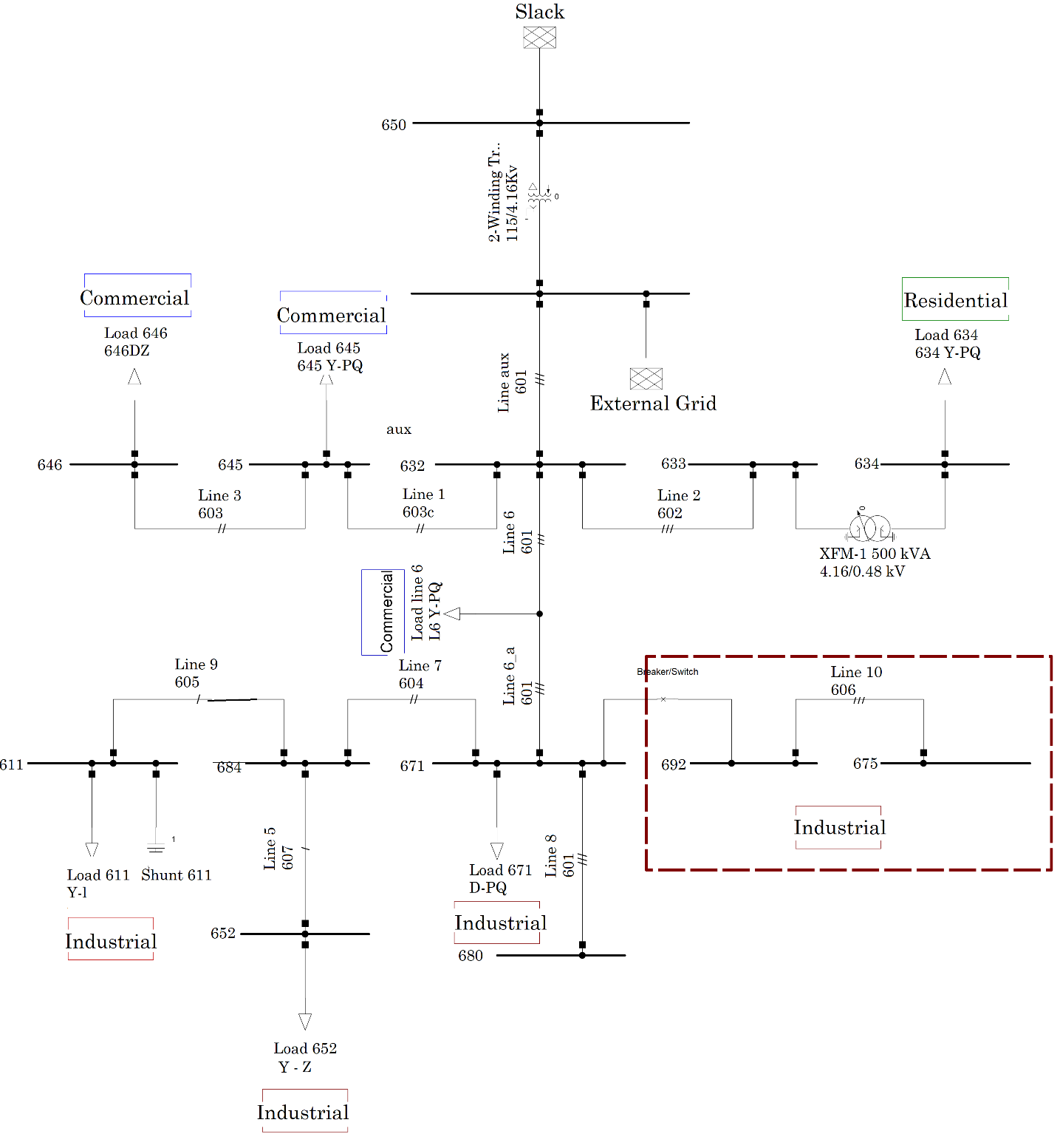 The IEEE 13-node test system is an electric network with a voltage level of 4.16 kV that represents a small and highly-charged radial distribution system [13]. The IEEE 13 Node Test Feeder has the following characteristics: