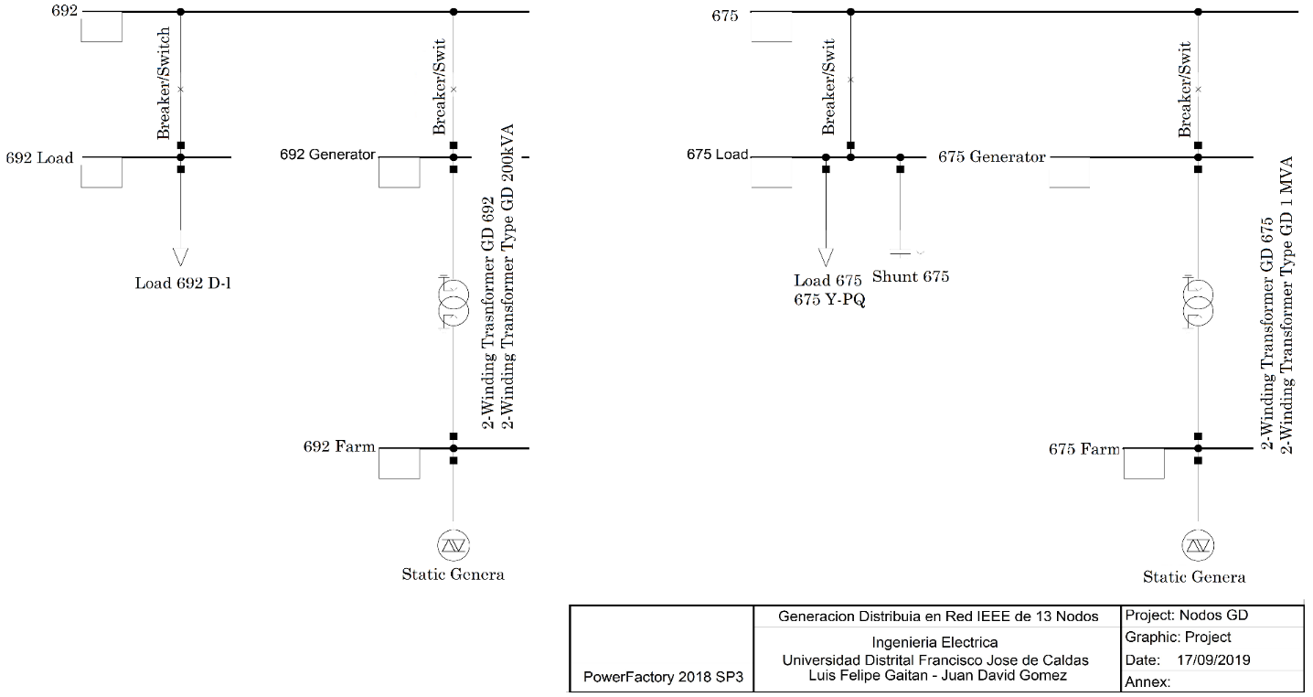 The new Distributed Generators (DGs) in the IEEE 13-node system (small-scale auto-generators, AGPE in Spanish, installed at two industrial nodes) were modeled with the Static Generator tool in DIgSILENT® Powerfactory software, which models DG technologies connected to a network through an inverter [15], [16].