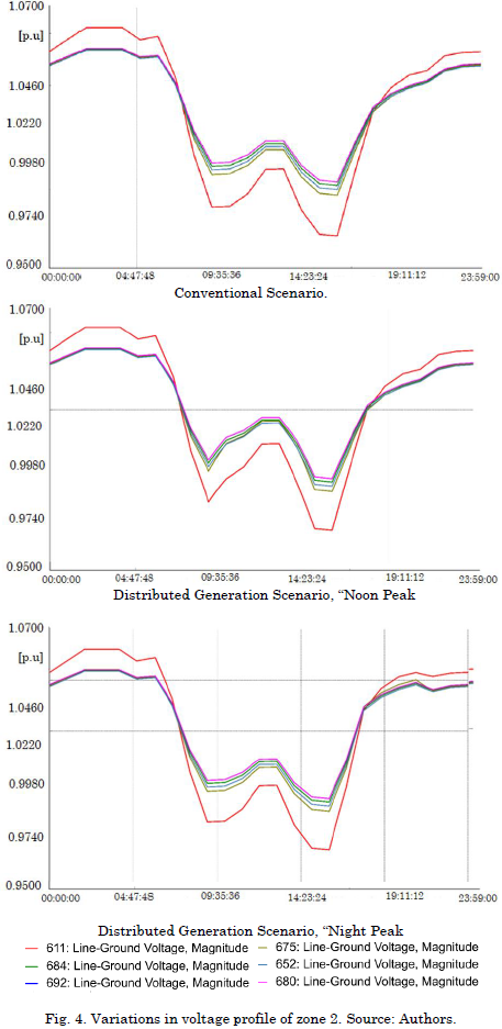 The voltage variations are illustrated in Fig. 4. In Zone 2, there is just a small increase in the voltage level of node 611 (red line) in the two DG scenarios, depending on the operation of the new DGs in the systems. In the other nodes, the system does not exhibit important voltage level changes, only a small increase at different hours, depending on the operation times of the DGs.