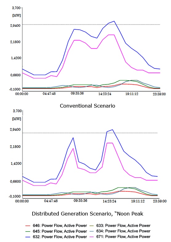 Fig. 6 illustrates how nodes 675 and 692 nodes change their active power levels during the activation of the DG systems. In the conventional scenario, two decreases can be seen in the power peak: one small close to 13:00 hours and an important one after 18:00 hours. This phenomenon produces an increase in the active power present in the DG nodes because, during those time periods, the power demand is lower than the generated power. The figures in this section are Active Power [p.u.] vs. Time [hours] curves.
