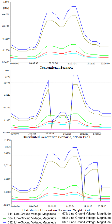 In this operation scenario, the electrical network has the new DG sources. Industrial nodes 675 and 692 have their DG systems operating. A previous research investigation indicates that the maximum power injection of the new generation units should be guaranteed during grid analysis [17]. Following that recommendation, the DG systems are set to their full generation capacity. The DG systems begin their power dispatch at 10:00:00 hours and end at 14:00:00, responding to the noon peak in the typical demand load curve of the country, as can be seen in Fig. 3. and Table 3. shows the load modifications in the scenarios.