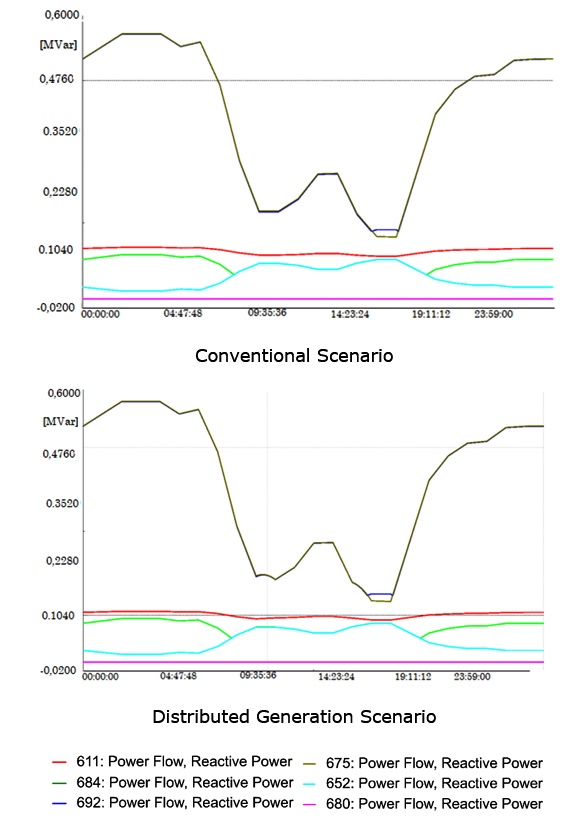 Fig. 7 presents the variations in the reactive power profiles. The new DG nodes do not imply significant changes in the reactive power levels. The reason for these unaffected active power levels is that the DG systems do not deliver reactive power to the grid. The figures in this section are Reactive Power [Mvar] vs. Time [hours] curves.
