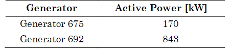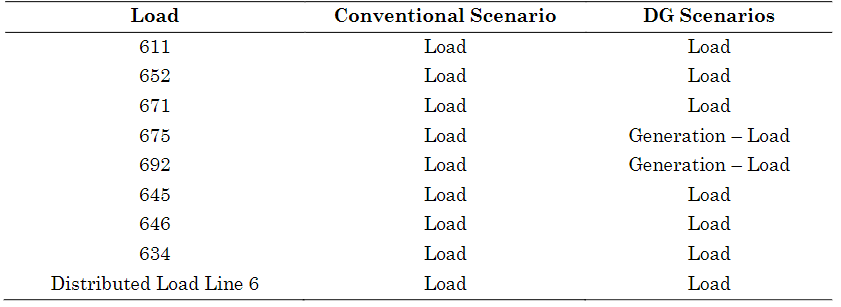 The spot-type load in the original power system was taken as the reference value for the characteristics of these generators, such as active and apparent power. Furthermore, the DGs were simulated as 0.9 inductive. Fig. 1 and Fig. 2, show how the load and the new generators were connected in the IEEE 13-node system. The power values of the new generators included are listed in Table 2.
