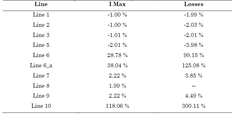 In the Distributed Generation scenario, some line losses decreased up to 107.86 %, but others escalated. In Line 6, losses increased by 99.15 %; in Line 6a, 125.08 %; and in Line 10, 300.11 %. Line 6a is the same Line 6 divided by the distributed load.