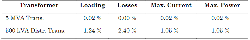 In the new DG zone, the simulation needs a special transformer to change the voltage level between the new generation system (Static Generator, DG node) and the node with the system connection point, where the original load is installed. A Breaker/Switch is used to control the connection of the DG node with the AGPE node. The losses of the new transformers are about 3 %, and their star connection is in neutral zero (YN-YN-0). Other values are the default values generated by DIgSILENT® Powerfactory.