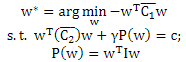 Nótese que (14) parece el problema de optimización inicial (5) pero ahora está acompañado de un término de regularización que permite que sea invertible. Esto permite introducir el problema de optimización de patrones Comunes Espaciales Regularizados (RCSP), el cual en forma general se plantea de la siguiente forma (15):