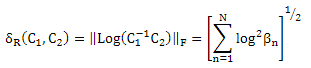 Las matrices de covarianza simétricas y definidas positivas, Ci, pueden ser utilizadas como representación de las señales EEG, Ei. Este tipo de matrices simétricas y definidas positivas pertenecen a una forma particular de variedad matemática conocida como variedad de Riemann, C(N). En esta variedad matemática, la distancia Riemanniana de dos matrices, C1 y C2, viene dada por (17):