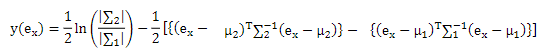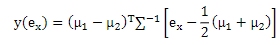 Finalmente, si se asume entonces la discriminación se puede obtener de forma lineal (LDA) mediante (24). Ambas expresiones (23) y (24) permiten clasificar a ex perteneciente a la clase 1 si y ≥ 0 y a la clase en 2 en caso contrario.