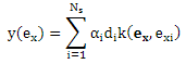 Las máquinas de vectores de soporte son otra opción robusta para clasificar ex mediante (25). Ns es el número de vectores de soporte obtenidos después de optimizar el problema dual asociado a la maximización del margen de separación entre las clases, αi son los multiplicadores de Lagrange no nulos obtenidos de este mismo problema, di son las etiquetas (+1 para la clase 1 y -1 para la clase 2) de los vectores de soporte y 𝑒𝑥𝑖 son los vectores de soporte los cuales son un subconjunto de los datos de entrenamiento [27]. En este caso y ≥ +1 clasifica para la clase 1 e y ≤ -1 clasifica para la clase 2.