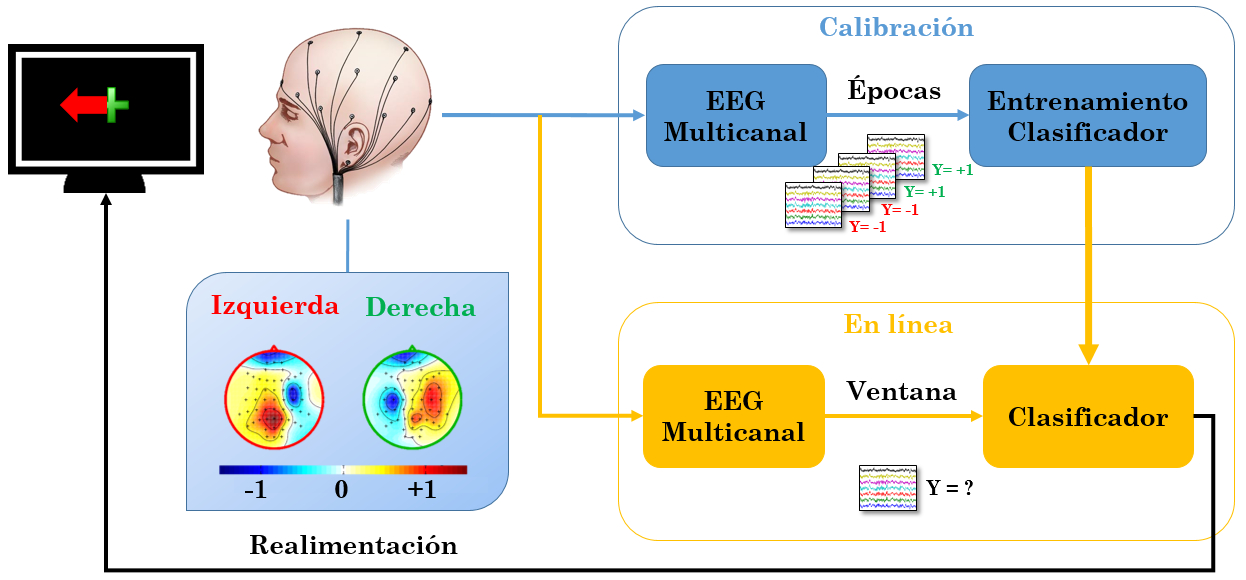 Las miBCI generalmente constan de dos fases [12,13,14]. Primero, una fase de calibración o entrenamiento, en la que se recogen segmentos (épocas) de las señales EEG (preferiblemente a nivel superficial) asociadas a dos o más intenciones motoras imaginadas, las cuales permiten entrenar un modelo de clasificación de señales EEG. Después, una fase de retroalimentación, en la que se utiliza el modelo entrenado para clasificar intenciones motoras con base en el protocolo de entrenamiento propuesto en la fase de calibración (ver Fig. 1). Para la construcción de estos modelos de clasificación se hace uso principalmente de técnicas de procesamiento digital de señales [15] y de reconocimiento de patrones [16], [17] que permiten el tratamiento adecuado de la no estacionariedad y la baja relación señal ruido de las señales EEG superficiales [18], [19] y la efectiva discriminación de diferentes tareas mentales, respectivamente.