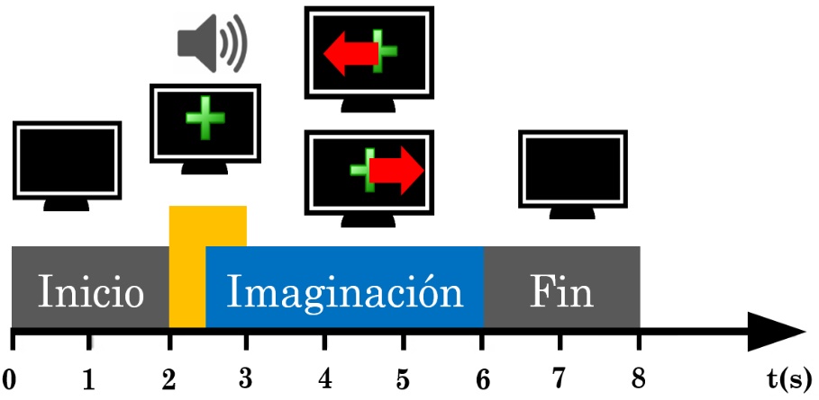 Por cada sujeto se realizaron 20 sesiones y durante cada sesión se ejecutaron 10 ensayos. Cada ensayo tuvo una duración de 8 segundos y solo se desplegó una de las flechas a la vez. El esquema de eventos durante cada ensayo se puede observar en la Fig. 2. Las épocas de las señales EEG para la imaginación de mano cerrada o abierta se extrajeron desde los 2 s hasta los 6 s. En cada sesión se siguió un protocolo de asepsia que consistió en limpiar el cuero cabelludo de los sujetos de experimentación con agua destilada y se aseguró que los canales del Emotiv EPOC presentaran alta calidad de contacto con ayuda del Software Emotiv Test Bench v.15.0.3. Las épocas de las señales EEG extraídas se procesaron mediante un filtro Butterworth de 5º orden pasa banda con frecuencias de corte de 8 – 30 Hz, con el fin de filtrar de forma plana las componentes sensomotoras asociadas a la imaginación de mano cerrada y abierta [35]. Se concibieron dos tipos de interfaces cerebro computador que aprovecharon la información de covarianza entre los canales de las épocas EEG. El primero de ellos utilizó esta información para la construcción de filtros espaciales óptimos que mejoraron la relación señal ruido, y el otro tipo de utilizó esta misma información como una nueva representación de las épocas de señales EEG, la cual pudo ser manipulada sobre una variedad Riemanniana para la construcción de filtros y clasificadores. La descripción matemática de las dos técnicas mencionadas anteriormente se lleva a cabo en las subsecciones siguientes.