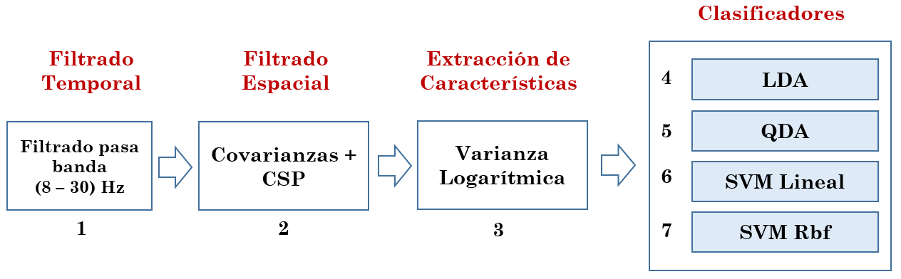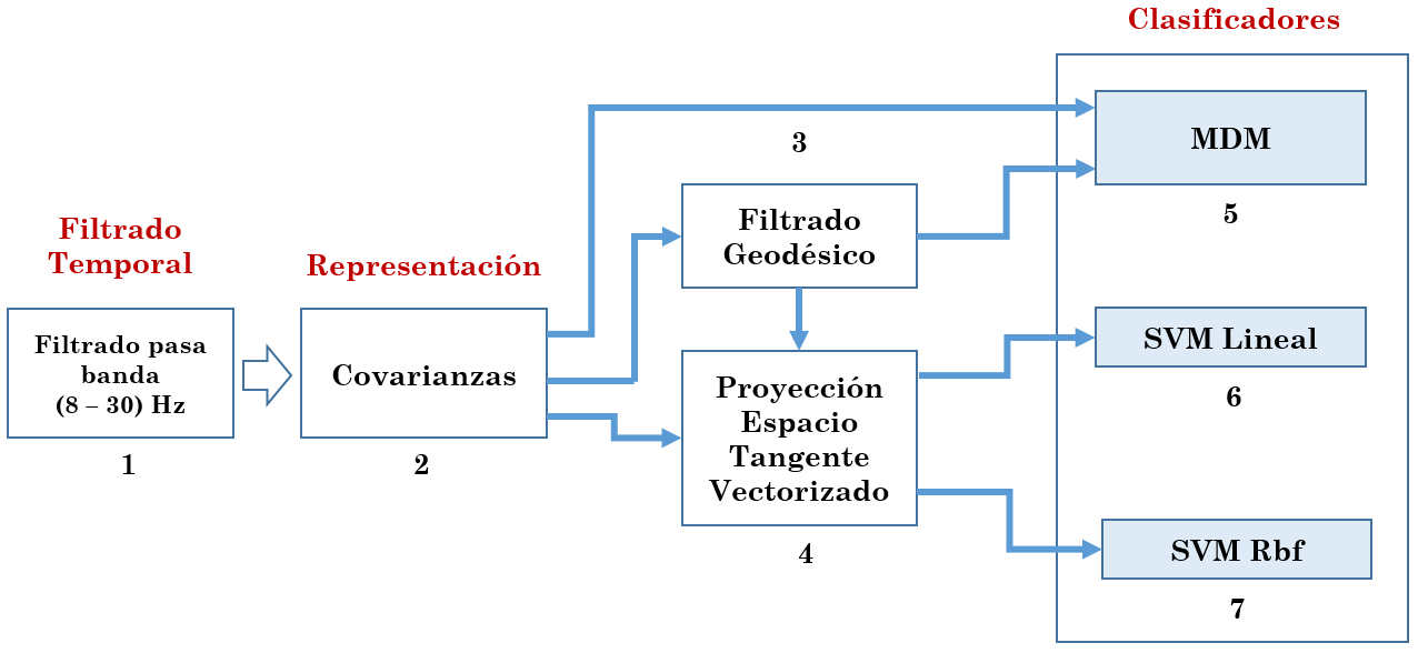 En los últimos años, dos técnicas que explotan la información de covarianza de las señales EEG han demostrado una destacable capacidad discriminante en un sinnúmero de retos internacionales sobre bancos de datos disponibles por parte de la comunidad científica para fines de comparación [20,21,22,24]. Las primeras utilizan la información de covarianza para la construcción de filtros supervisados espaciales, denominadas patrones comunes espaciales [23], [25], junto con técnicas de clasificación clásicas como el análisis discriminante cuadrático/lineal [26] o máquinas de vectores de soporte [17], [27].