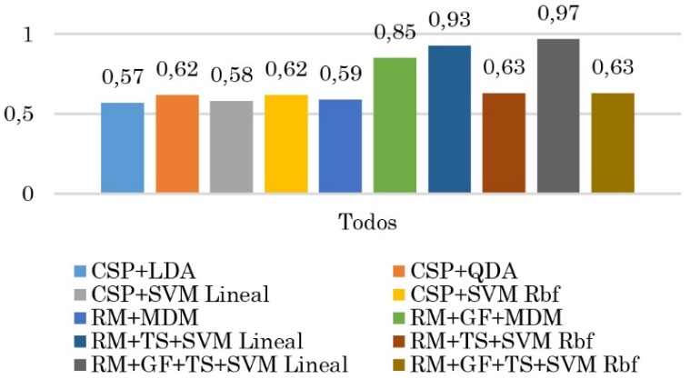 Aun cuando en las miBCI basadas en geometría de Riemann, Fig. 5, pudo considerarse también las técnicas de clasificación mediante los métodos discriminantes planteados en [23] y [24], en este estudio solo se consideró la MDM y las máquinas de vectores de soporte de kernel lineal y gaussiano (Rbf). En trabajos futuros se considerará estos y otro tipo de clasificadores, incluyendo la optimización de hiperparámetros para la obtención de los mejores valores de regularización que maximicen el desempeño de las arquitecturas propuestas.