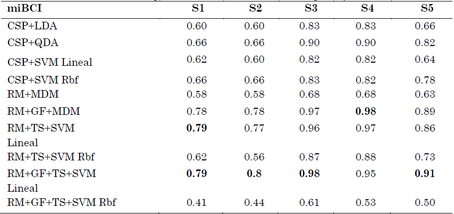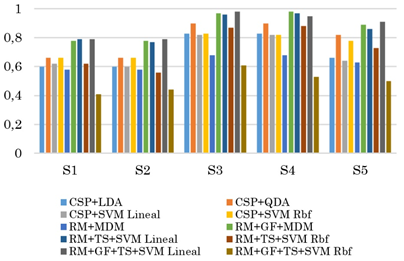 Y, en segundo lugar, se observa que mientras las miBCI en los sujetos con lesiones cervicales (S1 y S2) presentan un desempeño regular, en los sujetos de control se logran miBCI con desempeños buenos (S5: 0.91 – miBCI: RM+GF+TS+SVM Linear ) y muy buenos (S3, S4: 0.98 - miBCI: RM+GF+TS+SVM Linear, RM+GF+MDM). El bajo desempeño de las arquitecturas propuesta con respecto a los sujetos de control puede deberse a la reorganización de la actividad cortical sensomotora [45] que tiene lugar en los pacientes que han sufrido lesiones en el sistema nervioso central como es el caso de los pacientes con lesiones cervicales, lo que indicaría que es necesario una reubicación de los electrodos sobre el cuero cabelludo de los sujetos con lesiones medulares para obtener bioseñales más discriminantes. Es posible que una sintonización de los hiperparámetros (los cuales se dejaron fijo para este estudio) mejore el desempeño particular las miBCI de Riemann que utilizan SVM de kernel gaussiano.
